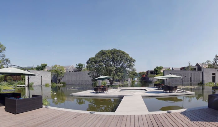 本項目以組團性、庭院式及小尺度的住宅設計元素為出發點,以中國傳統風格為基點,以現代設計手法進行演繹,在用地內以庭院為基本元素,形成組團布局,通過各個組團筑成中式空間的肌理;同時在用地內引入水景元素,打造出一條串連起整個區域的核心景觀帶;在關鍵空間節點處設計了較大面積的水景,構成了景觀主體,塑造出具有現代中式氣息的休閑居住社區。