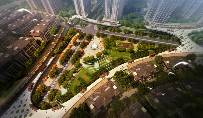 總平面布置將該中心片區分為商業和居住兩大功能。具體劃分為8#地塊主要有高層住區、洋房區和商業建筑;9#地塊布置有洋房區,低層住宅小區。另外,8#地塊布置有幼兒園。其中高層住宅區布置在8#地塊東側,緊鄰東面市政綠地,洋房區布置在悅山路兩側,低層住宅小區布置在地塊西面,緊鄰會展公園。