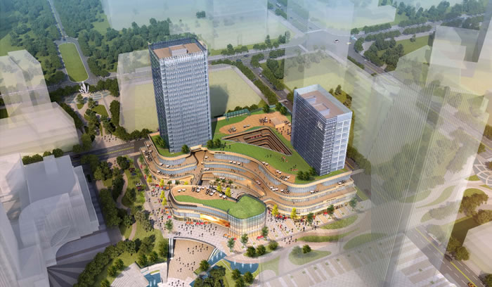 遵循核心區總體城市設計框架,結合地形與城市建筑群體空間環境,合理規劃布局。強調商業動線的合理性與流動性,將城市商業步行街與建筑主要出入口無縫銜接,將建筑與城市廣場融為一體。著力塑造城市公共界面的都市商業綜合體建筑形象,以現代簡潔的造型和高品質的外墻材料充分體現城市核心的總體印象。分析綜合建筑群的功能個性、考慮各種功能業態的使用要求,合理安排各種流線,創造舒適、優美、高效的商業、辦公環境。通過對地塊及周邊環境的分析,利用東西高差,在西北側形成吊層商業。整體布局是將1#辦公樓布置在東北面,緊鄰金龍大道,將2#辦公布置在西南面靠步行街口部位置,讓兩棟塔樓都能獲得優越的昭示性和可達性;西北角面向中心下沉廣場布置獨立商業體,結合南面和東面形成統一、整體、大氣的商業界面。